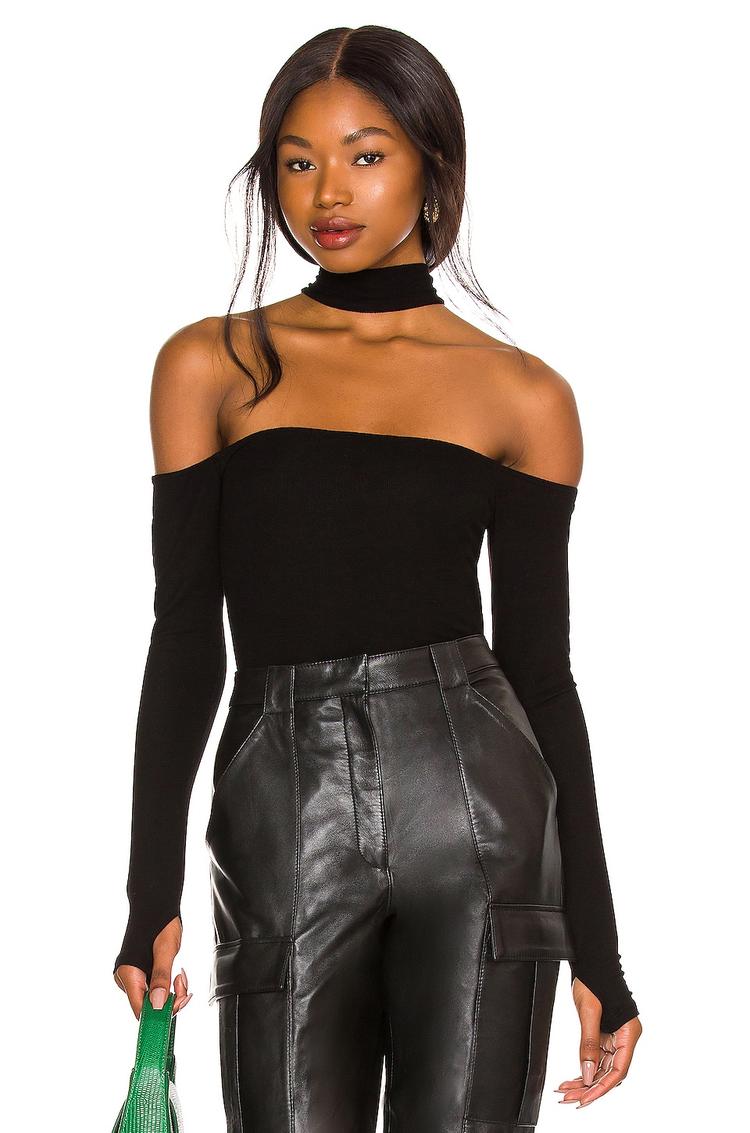 Sleek and form-fitting, this matte black tank top features an elegant off-shoulder style combined with a chic racerback neck collar. Crafted from a soft ribbed viscose-elastane blend, it offers both comfort and stretch. The long sleeves include subtle thumbholes, adding a modern edge to the silhouette. Its hip-length cut and slim fit make it versatile for casual outings, night events, or date nights, blending contemporary design with everyday ease.