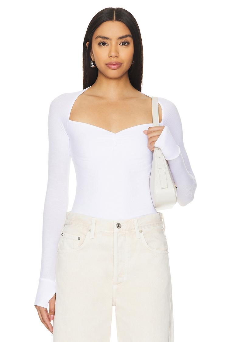 Effortless everyday elegance in a white Kiran Sweetheart Neck Top by Michael Lauren. Crafted from a soft viscose-elastane blend (95% viscose, 5% spandex) for a silky, stretchable feel that hugs a cropped, figure-skimming silhouette. The sweetheart neckline flatters the décolletage while the long sleeves balance the fit into a polished, versatile piece. A pullover style with a clean, Covered Back that pairs beautifully with high-waisted jeans or tailored trousers. Dress it up with a blazer for date nights or keep it minimalist for chic, casual wear. Made in the USA and machine washable for easy care.