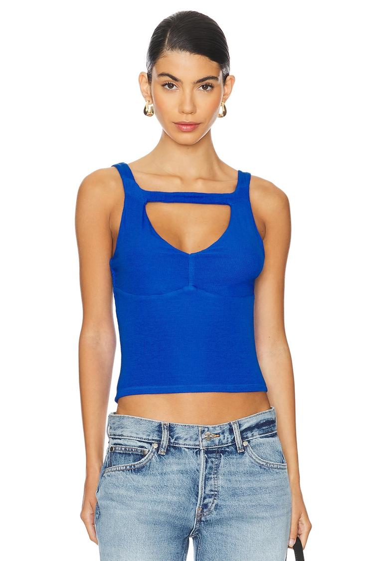 Bright blue ribbed jersey fabric shapes this fitted cropped tank top, perfect for warm weather. Featuring a striking cut-out detail at the V-neckline and wide straps, it offers a modern minimalist vibe. The slip-on closure and stretchy viscose-elastane blend ensure comfortable wear. Ideal for casual outings, brunch dates, or everyday layering, this tank blends style and ease effortlessly.