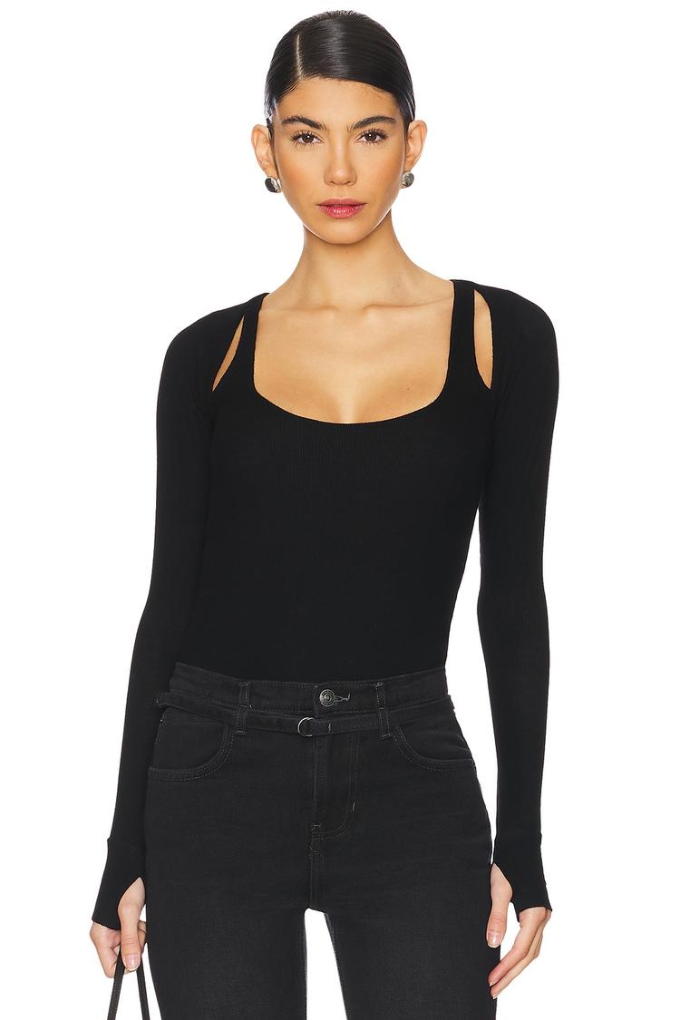 Sleek ribbed jersey fabric pairs with a fitted silhouette and long sleeves for a chic, modern look. The classic scoop neck is enhanced by stylish shoulder cutouts, adding a subtle edge to this hip-length tank top. Thumbhole details on the sleeves offer both function and fashion, making it perfect for layering or standalone wear. This black fitted top combines comfort and sophistication, ideal for casual outings, workwear, or evening dates. Crafted from a viscose-spandex blend, it provides stretch and breathability for all-weather versatility.