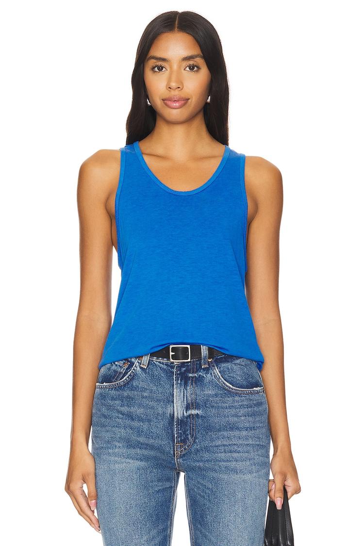 Softly contoured in a breathable blend of lyocell and cotton, this fitted tank features wide straps and a classic round neckline for a minimalist yet chic look. Its sleeveless, hip-length silhouette offers comfort and versatility, making it an ideal pick for casual days, everyday wear, or travel. The solid blue hue adds a fresh pop of color that pairs effortlessly with denim or layered styles for a relaxed, polished outfit.