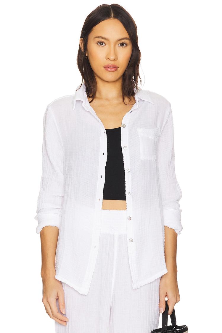 Lightweight cotton gauze and a relaxed fit define this classic white shirt with a hip-length hem. Featuring a traditional collar, long sleeves with mother-of-pearl button cuffs, and a front button closure, it offers a minimalist and casual chic style. The semi-sheer fabric adds a delicate touch, complemented by a practical breast slip pocket. Perfect for everyday wear, travel, or business casual settings, this versatile shirt combines comfort and understated elegance for multiple occasions.