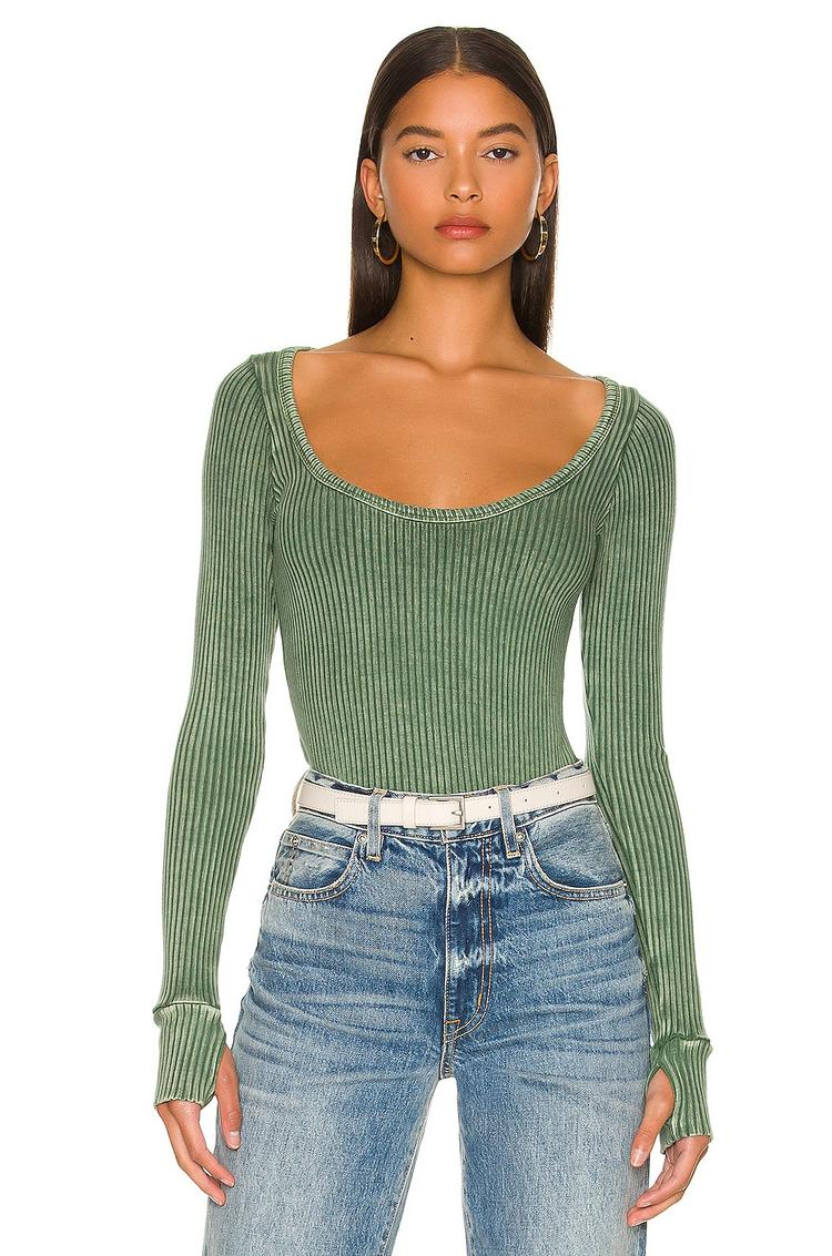 Soft ribbed jersey fabric with a subtle faded wash crafts this fitted tank top in a muted green hue. Featuring long cuffed sleeves with thumbhole details and a flattering U-neckline, its hip-length silhouette offers a minimalist yet chic look. Perfectly suited for casual wear, everyday errands, or a relaxed brunch, this versatile top blends comfort with effortless style. The slight stretch from rayon and elastane ensures a comfortable fit that moves with you, making it a dependable choice across seasons.
