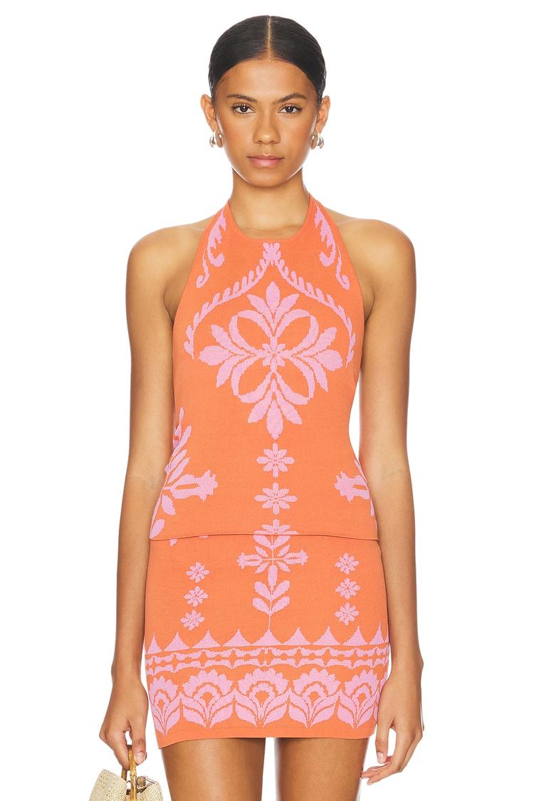A halter neck camisole crafted in a lightweight knit fabric featuring a fitted silhouette and a chic back tie closure that highlights the open back. This cropped length top showcases an all-over floral pattern in soft pink against a vibrant matte orange base, perfect for spring and summer wear. Ideal for casual days, brunch outings, or night events, its sleeveless design and comfortable stretch blend of viscose, polyamide, and elastane create a flattering, modern look that pairs effortlessly with skirts or jeans.