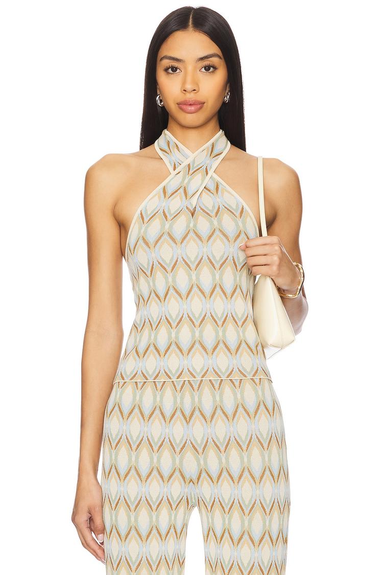 Crossover halterneck design with an extended draped tie detail creates a sleek and modern silhouette in this slim-fit tank top. Crafted from a midweight viscose and polyamide knit fabric, it features a non-slip silicone neckline at the back for added comfort and security. The geometric all-over pattern in soft cream, taupe, and light blue hues elevates its chic appeal. Perfect for spring and summer outings, this waist-length top suits casual days, brunch dates, and relaxed evening occasions with ease and style.