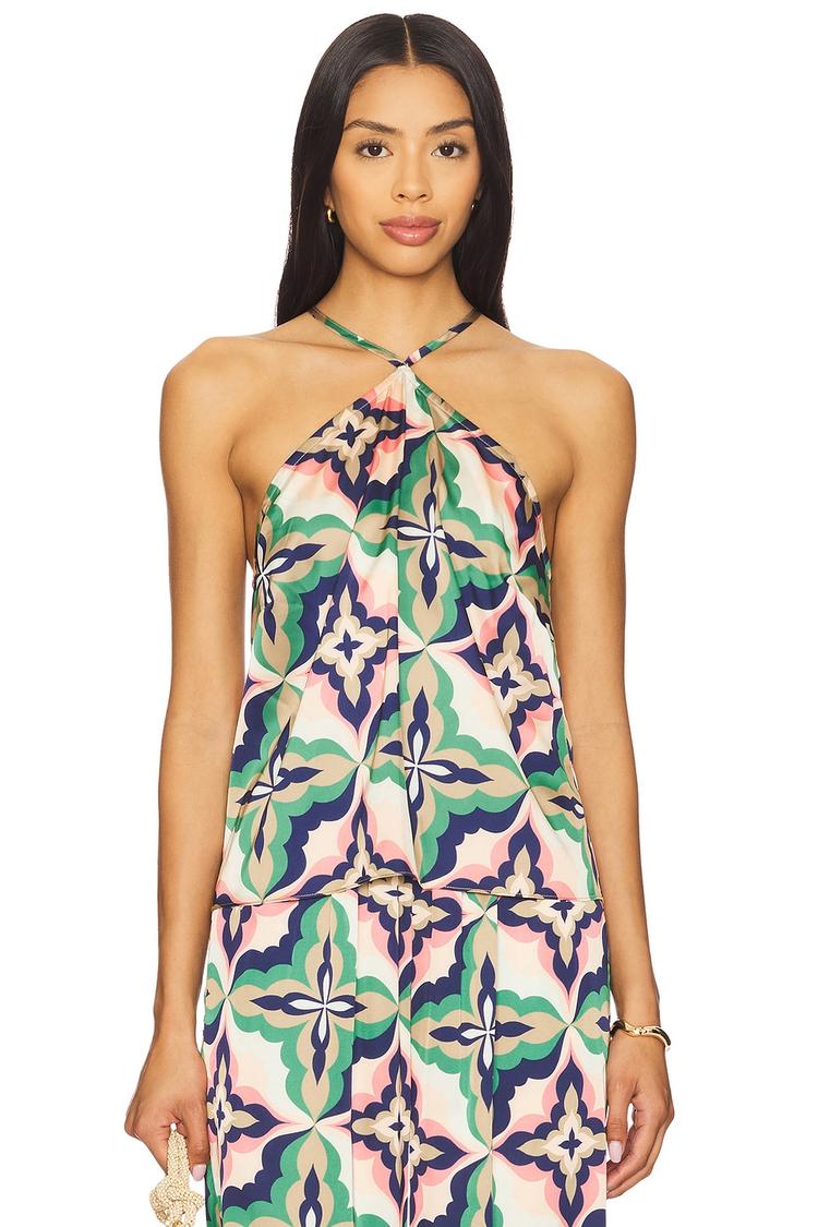 Lightweight satin fabric and a halter neck come together in this chic camisole with a regular fit and hip length hem. The abstract all-over print in green, purple, and pink hues creates a modern and trendy look perfect for spring and summer occasions. The strapless sleeve styling with a strappy back adds an elegant touch, making it ideal for casual outings, brunch dates, or night out events. Pullover closure ensures ease of wear, while the blend of polyester and spandex offers comfort and subtle stretch.