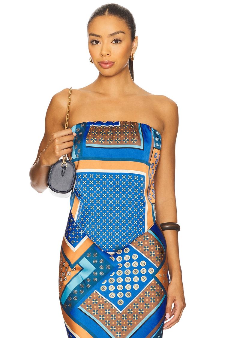 Bold geometric prints in matte blue and beige adorn this fitted bandeau top crafted from midweight polyester charmeuse. The smocked bodice adds subtle texture and stretch for a comfortable, flattering fit. Its cropped length and strapless neckline make it ideal for warm-weather outings, from casual brunches to lively nights out. Easy to wear with its pullover style, this modern and trendy top elevates your spring and summer wardrobe with effortless chic.