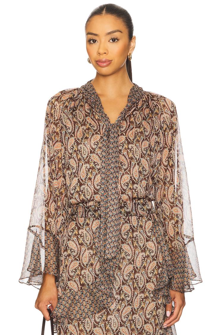 Lightweight chiffon and a loose blouson silhouette define the Maris Top, featuring a romantic all-over paisley print in beige, black, and dusty rose. Its long flounce sleeves and V-neckline complement the front self-tie bow detail, adding feminine charm. The semi-sheer fabric offers an airy feel perfect for spring and summer, making it suitable for casual outings, brunch dates, or workwear. The hip-length cut and relaxed fit ensure comfort with a bohemian vibe, while the covered back and delicate design details elevate everyday elegance.