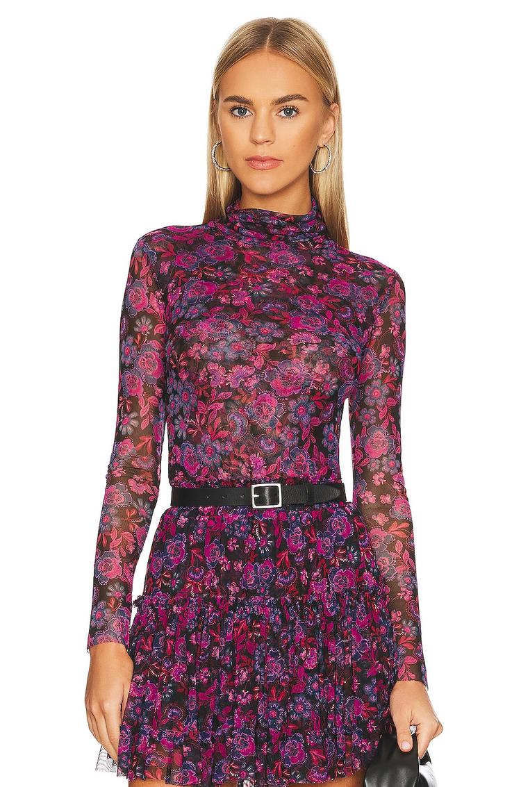 Delicate mesh fabric adorned with a romantic all-over floral print creates a fitted shell top with long regular sleeves and a chic mock neck. The lightweight, sheer texture combined with ruffled hem and sleeve details enhances its feminine silhouette, perfect for spring and autumn outings. This hip-length top suits a variety of occasions including casual days, brunches, date nights, and night outs, pairing beautifully with skirts or tailored pants for a trendy yet elegant look.
