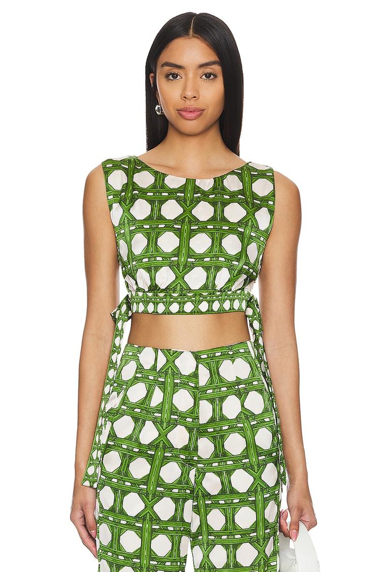 With a bold green and white abstract print, this cropped top features a fitted silhouette and wide straps that frame the round neckline. The sleeveless design is perfect for warm spring and summer days, while the open back with side button closures and satin ties adds a chic, modern edge. Crafted from a comfortable cotton-elastane blend, it pairs effortlessly for casual outings, brunch dates, or stylish day-to-night looks.
