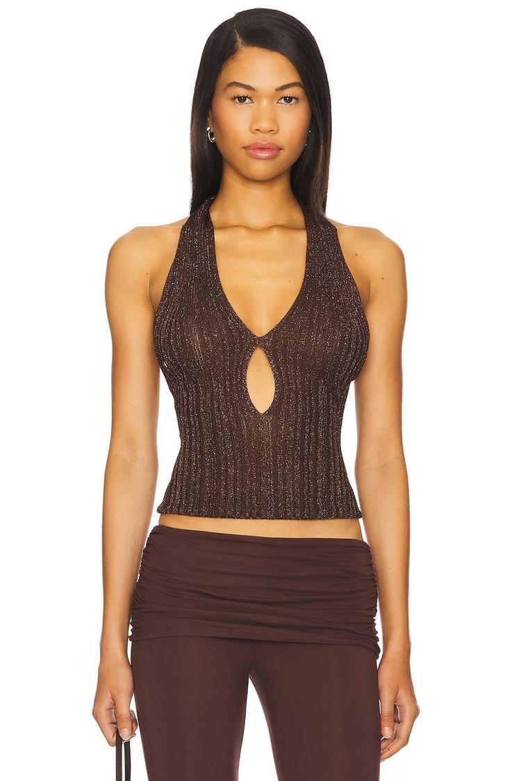 Metallic dark brown ribbed knit fabric with subtle shimmer highlights this fitted halterneck tank top featuring a draping tie closure at the back. The sleeveless design and cut-out front add a modern, sexy edge to the waist-length silhouette, making it a chic choice for casual outings, date nights, or evening events. Crafted from a viscose-nylon blend with metallic threading, this knit top combines comfort with eye-catching style for warm seasons.
