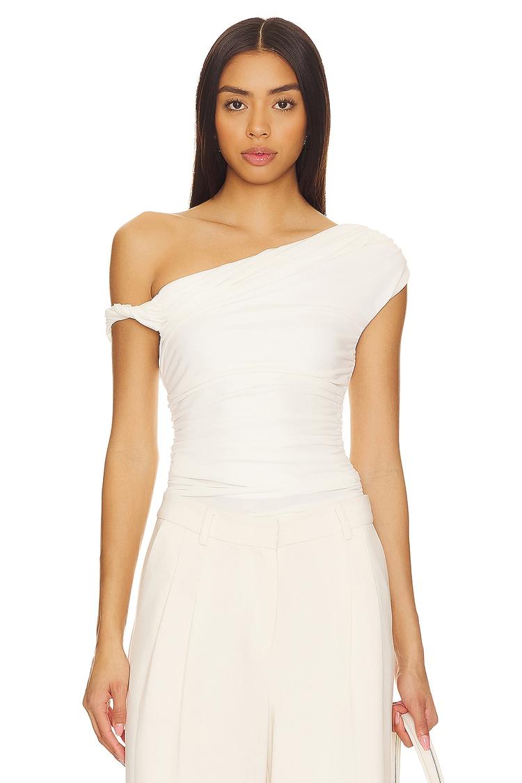 Softly ruched all over and crafted from slinky polyester jersey, this close-fitting cropped top features a chic off-shoulder neckline and wide strap sleeve styling. Its waist length and modern silhouette make it an alluring choice for casual outings, date nights, or night outs. The matte white hue enhances its versatile appeal, while the pullover closure ensures easy wear. A sleek, sexy top that pairs beautifully with high-waisted trousers or skirts for a confident, contemporary look across seasons.