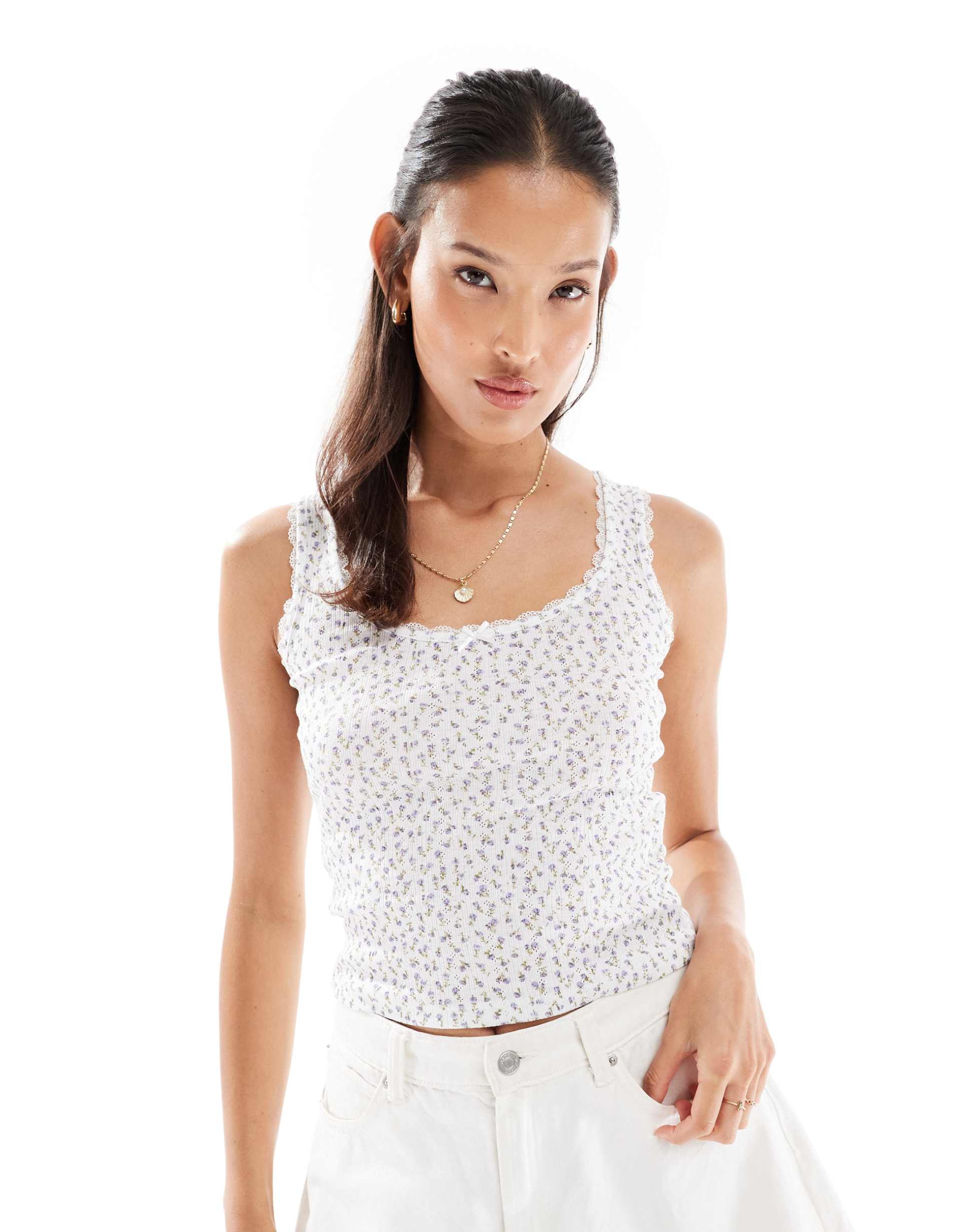 MISS SELFRIDGE LACE TRIM POINTELLE TANK TOP IN MICRO FLORAL