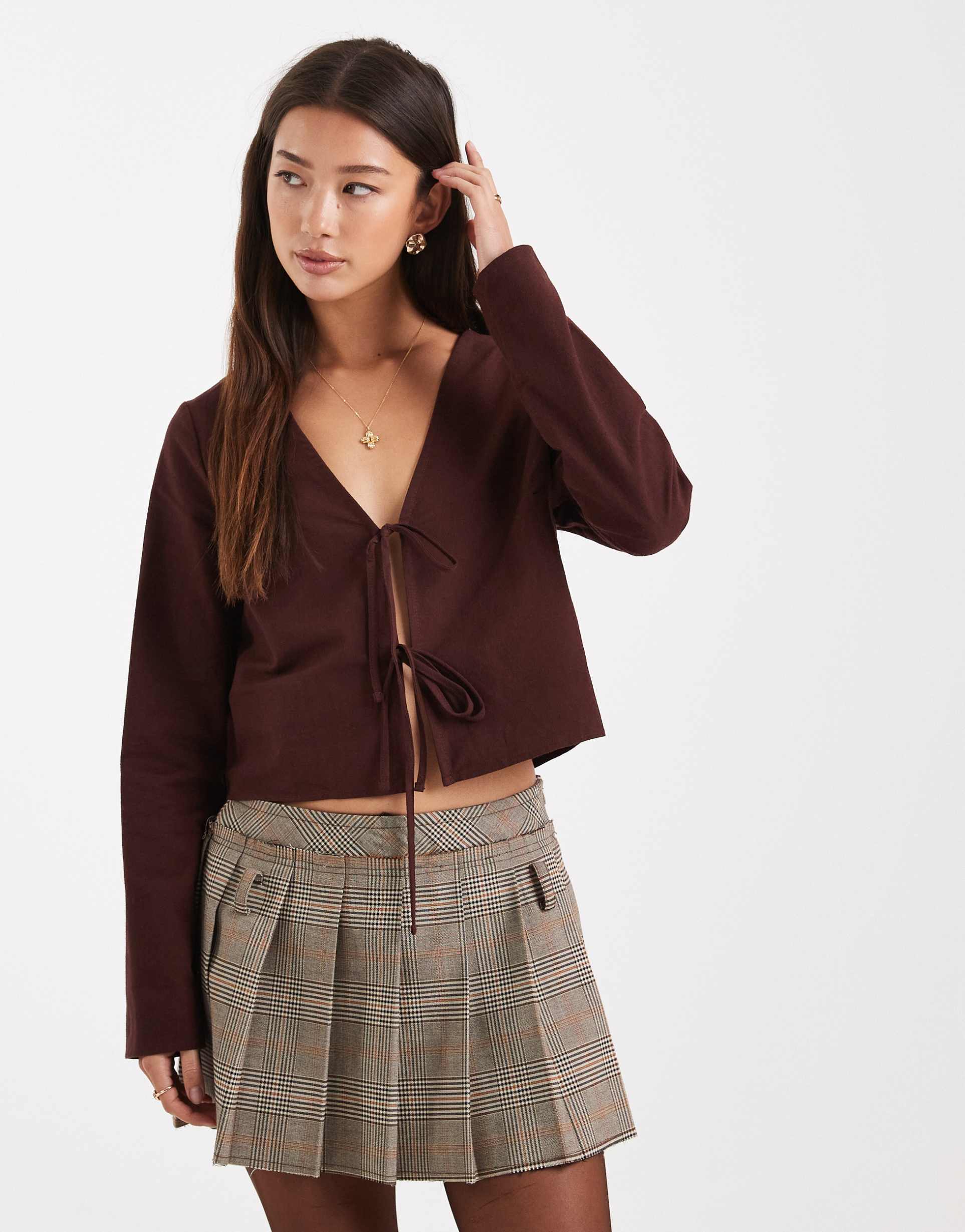 MISS SELFRIDGE LONG SLEEVE TIE FRONT TOP IN CHOCOLATE