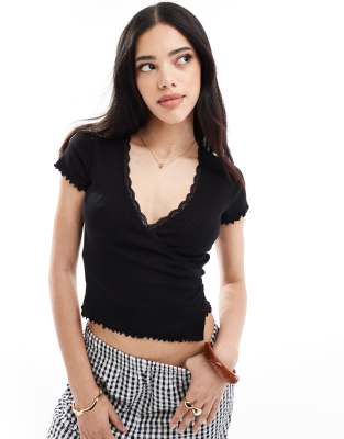 Effortlessly chic in classic black, this Miss Selfridge wrap top elevates everyday styling with a touch of romance. The pointelle jersey knit creates a delicate texture, while the scalloped lace trim accents the plunging V-neck and wrist-swept cap sleeves. A concealed tie-back wrap defines the silhouette, finishing just above the natural waist for a cropped, flattering fit. Versatile enough for a day out with high-rise denim or a night out with a sleek skirt, this top pairs soft, breathable fabric with a graceful drape for polished weekend looks and date-worthy evenings alike.