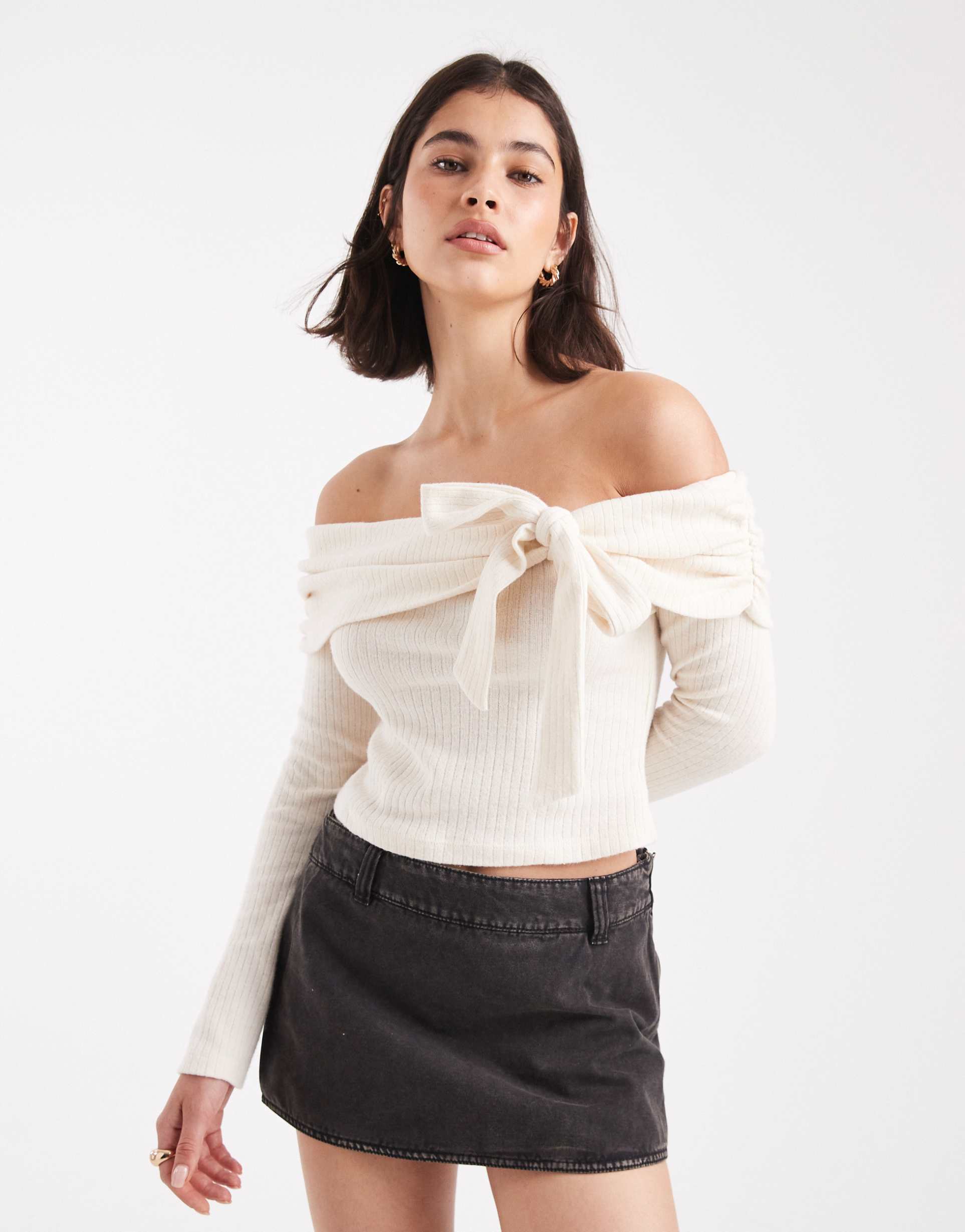 Soft ribbed knit fabric and a slim fit define this cropped bardot top in a versatile cream shade. Featuring long sleeves and ruched sides, it offers a flattering silhouette completed by a charming bow detail at the off-shoulder neckline. Ideal for casual outings, brunch dates, or relaxed evenings, this classic chic piece brings a refined yet effortless vibe to your wardrobe.