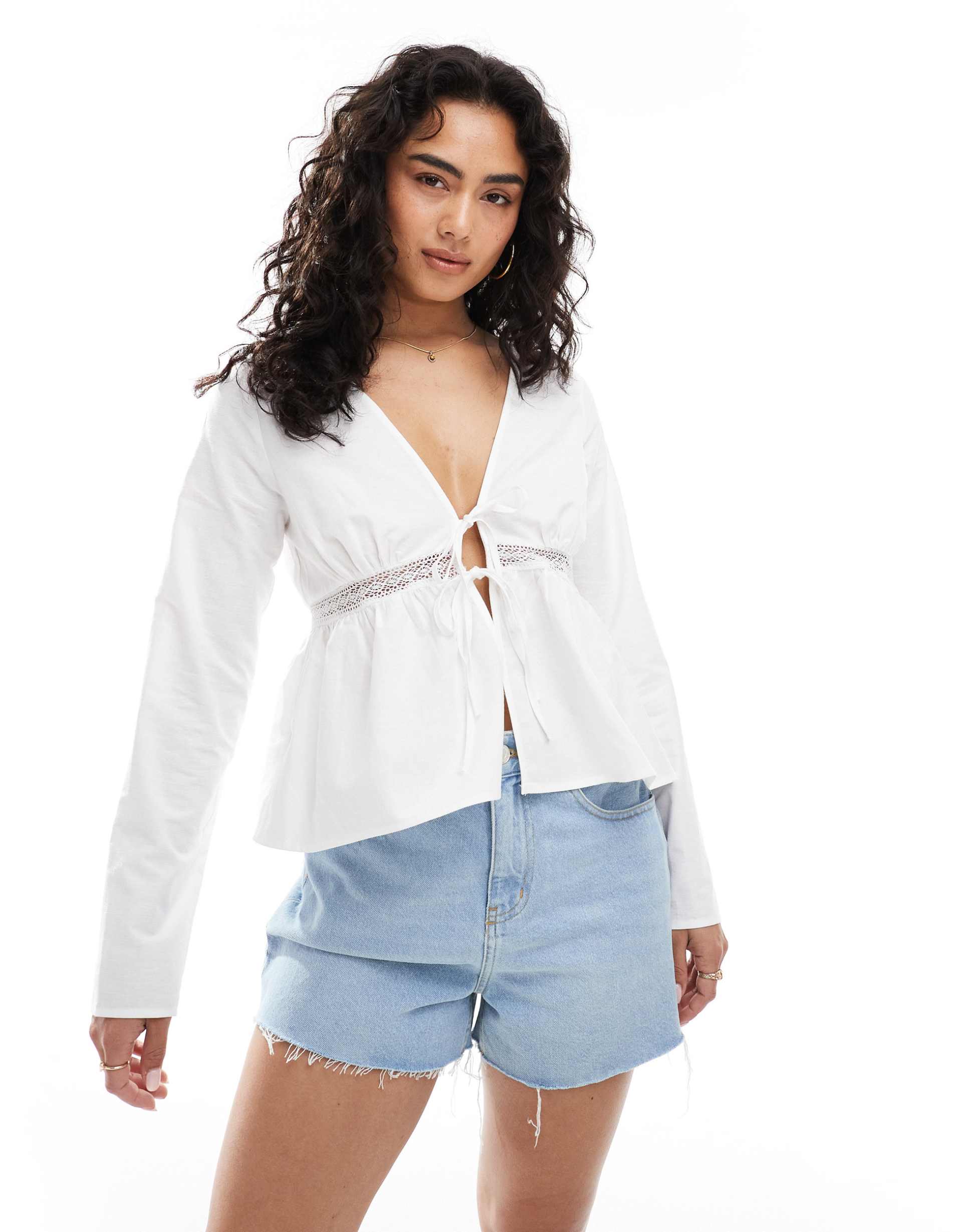 Crisp cotton-linen blend fabric with a subtle crinkle texture defines this wrap top, featuring a plunging neckline and long regular sleeves. The hip-length hem complements the regular fit, while delicate lace trims along the bodice and front add a refined touch. The tie-up closure enhances its casual chic appeal, making it a versatile choice for brunch, everyday wear, or relaxed spring and summer outings.