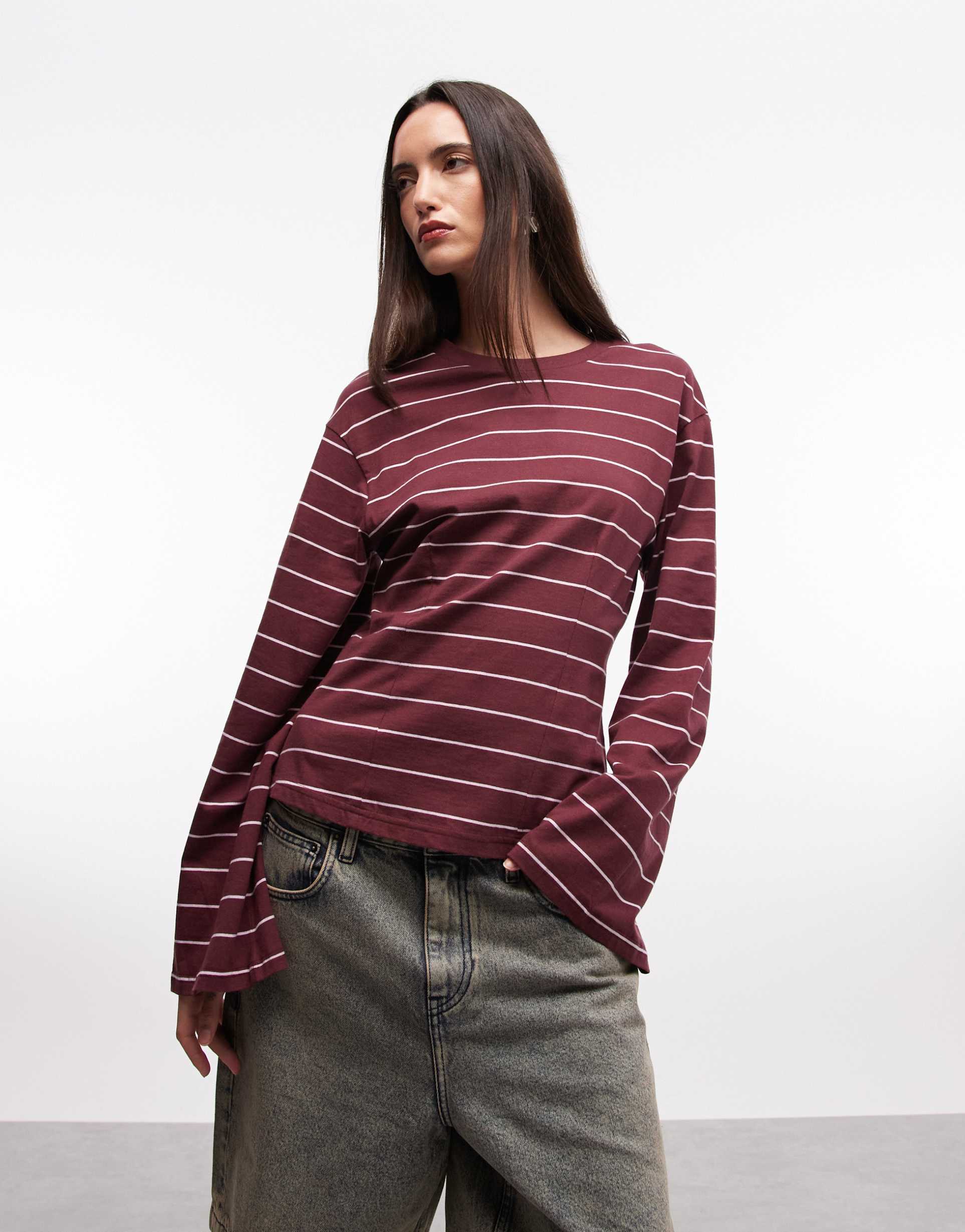 MONKI CINCHED LONG SLEEVE TOP IN BURGUNDY AND PINK STRIPE