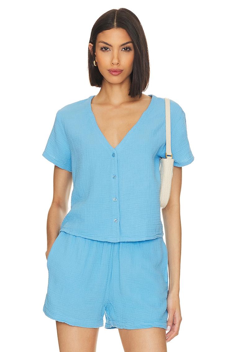 Lightweight and breezy, this gauze button-down top in a soft blue elevates casual days with effortless charm. The V-neckline and front button closure create a relaxed, breathable silhouette, perfect for warm-weather adventures. Made in a breathable 100% cotton gauze, the top drapes softly over the frame with a loose, waist-length fit and regular short sleeves, making it ideal for pairing with matching shorts or layering over a swimsuit. Versatile for everyday wear, it transitions from sunlit brunches to relaxed getaways with easy, chic polish.
