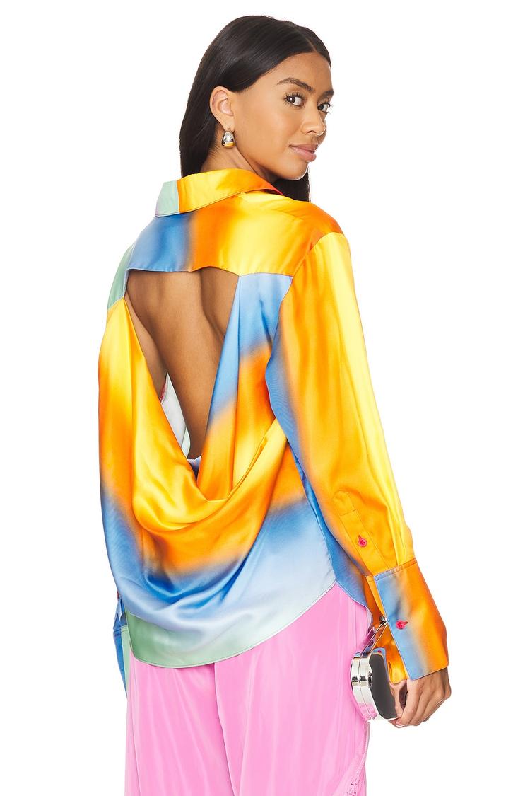 Radiate effortless elegance in this blouson blouse crafted from luxurious silk satin. Featuring a vibrant gradient palette of bright orange, red, pale green, and light blue, it boasts a relaxed fit with long regular sleeves and a classic collar. The standout cowl back cut-out adds a contemporary twist, complemented by a curved hem that enhances movement. Perfect for spring to autumn wear, this hip-length blouse suits casual outings, brunch dates, and night events with a chic, modern flair.