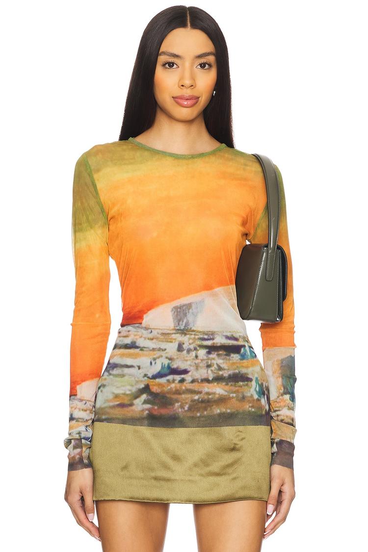 Semi-sheer mesh fabric in a slim fit gives this hip-length shell a fresh, modern vibe. The crew neckline and long regular sleeves create a balanced silhouette, while the abstract all-over print blends warm matte orange with olive and cool blue tones for visual interest. Pull-on styling ensures easy wearability, making it ideal for casual days, streetwear looks, or brunch outings. This chic, trendy top pairs perfectly with layered pieces or statement bottoms for a versatile seasonal addition.