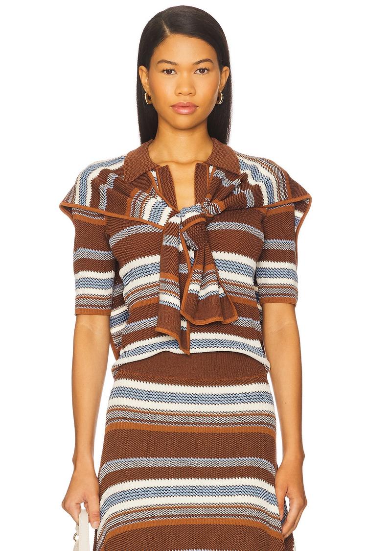 Richly textured in heavyweight knit fabric, this striped jacquard shell top features a flattering V-neck and elbow-length sleeves for a modern, fitted silhouette. The classic brown base is accented with white, blue, and gray stripes, offering a timeless palette ideal for autumn and winter. Ribbed trims add subtle detailing, while the pullover design ensures easy wear. Versatile for casual days, workwear, or weekend brunches, it also comes with an optional scarf for an elevated styling option. Embrace comfort and refined style with this minimalist knit piece.