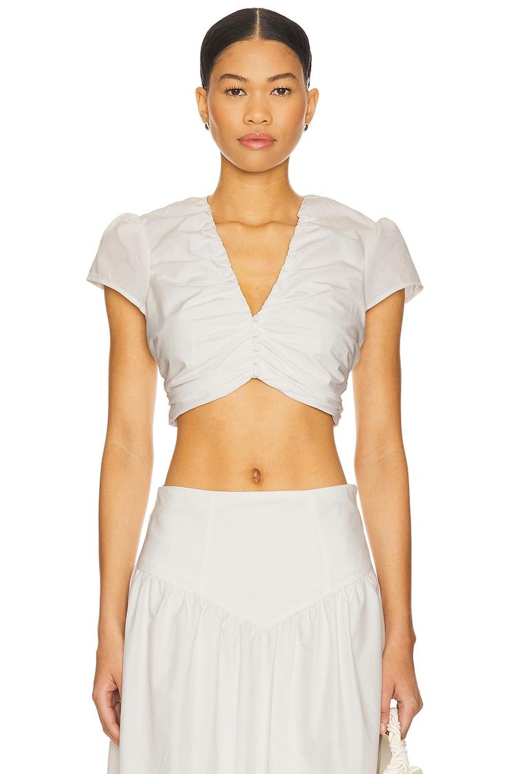 Crisp white midweight poplin fabric shapes this cropped Amaya top with a fitted silhouette and V-neckline. The front button closure and ruched detailing add texture and charm to the modern casual chic design. Half sleeves provide a balanced coverage, making it ideal for spring and summer days. Its versatile style suits casual outings, brunches, and vacation wear, blending comfort with contemporary flair.