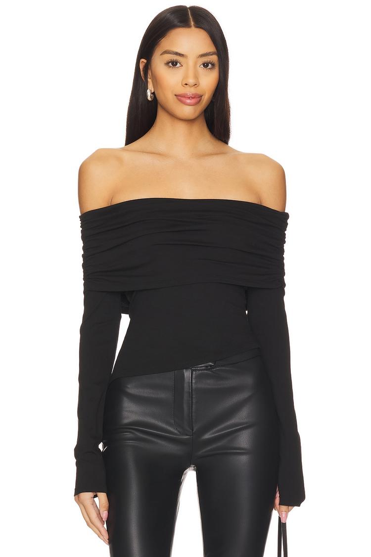 A sleek black off-shoulder top crafted from a midweight viscose-elastane jersey blend, offering a fitted silhouette that enhances your figure. The foldover neckline adds a refined twist to the classic off-shoulder style, with long regular sleeves balancing the look. Waist-length and cropped in design, this pullover top pairs effortlessly with leather pants or skirts for versatile styling. Ideal for casual outings, date nights, and chic brunches, its minimalist yet sexy vibe makes it a standout piece in any wardrobe for all seasons.