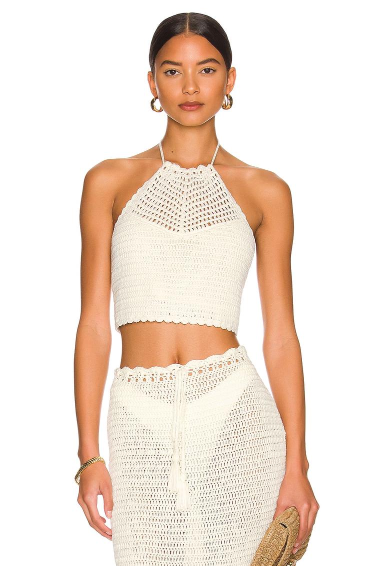 Crochet texture and delicate scalloped edges define this halter neck cropped top in a soft cream hue. The fitted silhouette with sleeveless, strapless styling and a tie-back closure finished with beaded tassels adds bohemian charm. Crafted from acrylic and polyester, its lined bodice ensures comfort. Ideal for casual outings, beach days, or vacation, this trendy piece pairs effortlessly with high-waist skirts or shorts for brunch or date night looks.