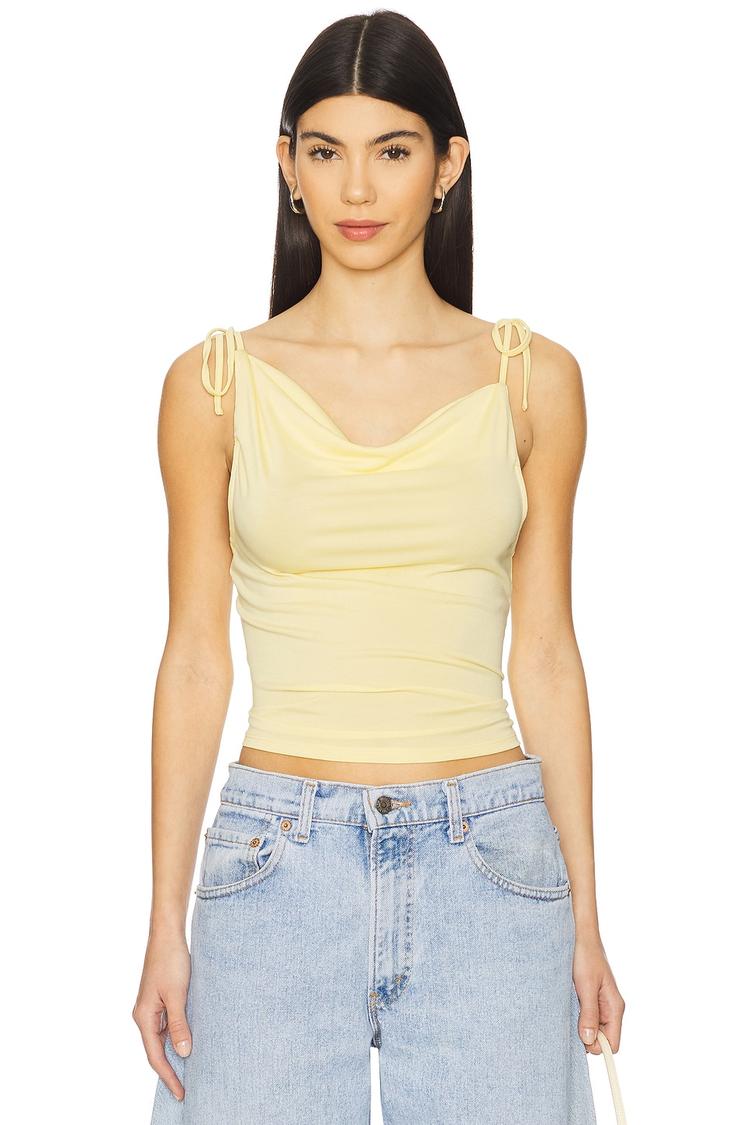 Soft drape and delicate self-tie spaghetti straps define this slim-fitting camisole crafted from a comfortable viscose-polyester jersey blend. Its light yellow hue and waist-length cut offer a fresh, minimalist look perfect for spring and summer days. Ideal for casual outings, brunch dates, or relaxed evenings, this versatile piece pairs effortlessly with jeans or skirts for an easy chic style that feels both modern and timeless.