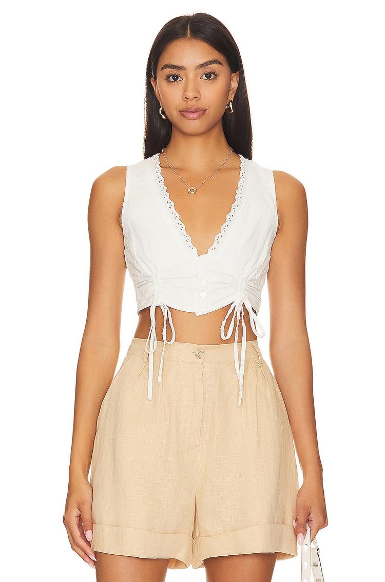 Delicate ruffles and eyelet trim define this cropped deep neck top crafted from breathable cotton. The sleeveless design with wide straps and front ruched drawstring adds a slim, flattering fit, perfect for warm spring and summer days. Button closure and intricate detailing on the front and bodice elevate the casual-chic vibe, making it an ideal choice for brunch, casual outings, or romantic date nights. This versatile piece blends cute and romantic style with comfort and breathability.