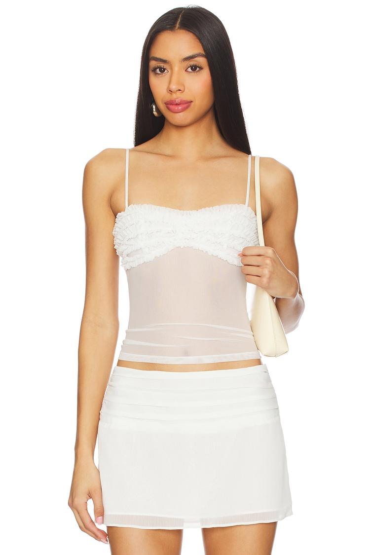 Delicate mesh fabric and subtle ruffles at the bodice create a modern and sexy silhouette with this off-white camisole. Featuring adjustable spaghetti straps and a straight neckline, its slim fit and waist length make it ideal for warm spring and summer days. The sheer texture adds an alluring touch, perfect for casual outings, brunch dates, or night outs. Easy to style and pull on, this lightweight top blends minimalist charm with contemporary appeal for versatile wear.