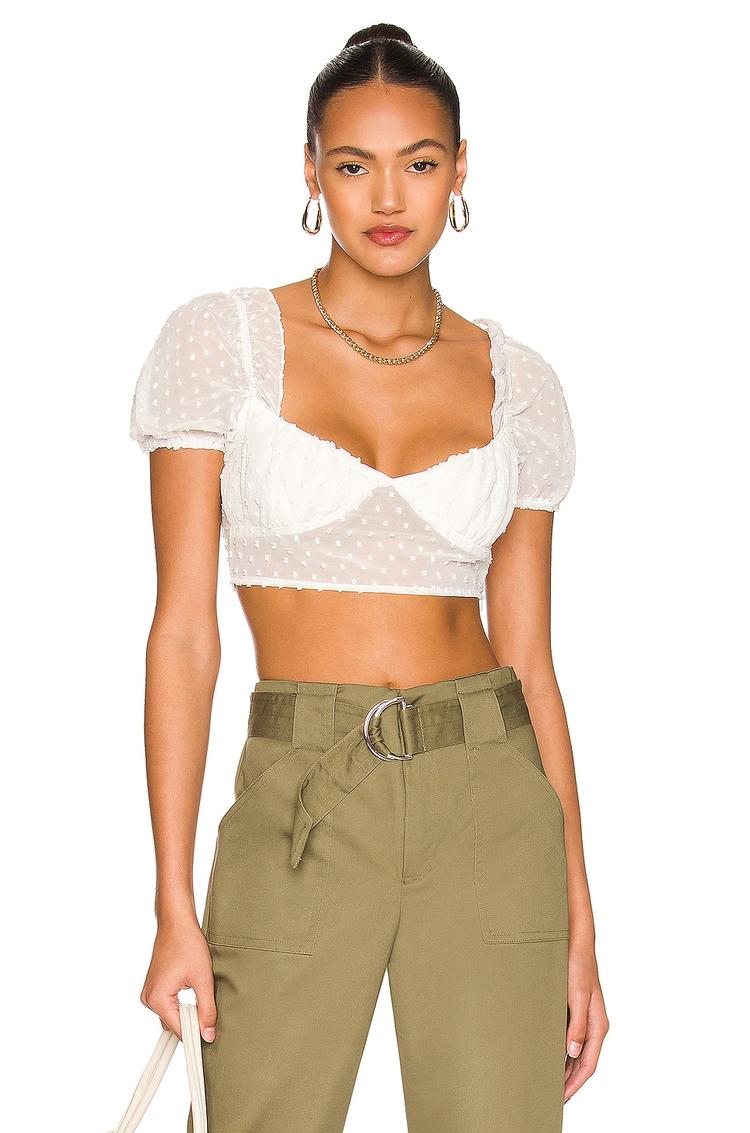 Rise to sunlit days in the Iris Puff Sleeve Top by More To Come. A cropped, wrap silhouette in sheer crepe de chine with delicate fil coupé polka detailing, crafted in 100% polyester. The surplice neckline forms a soft, flattering V, while elastic-edged blouson sleeves add playful volume. A concealed side zipper keeps the fit smooth, with a lined bust for modesty. Pair with high-waisted khaki pants for brunch, a vacation date, or a night out—this top is lightweight, effortlessly chic, and endlessly versatile for warm-weather styling.