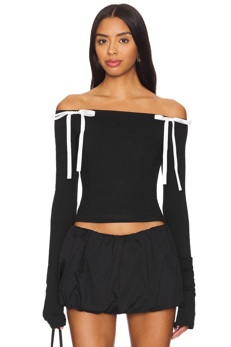 Soft midweight jersey fabric shapes this cropped off-shoulder top with a relaxed fit and long sleeves. The minimalist black silhouette is elevated by contrasting white bow accents on the shoulders, adding a chic and feminine touch. The wide strap sleeve styling complements the neckline's off-shoulder design, creating an elegant yet casual look perfect for brunch, casual outings, or date nights. Crafted with a comfortable rayon-spandex blend, this pull-on top balances style and comfort effortlessly.