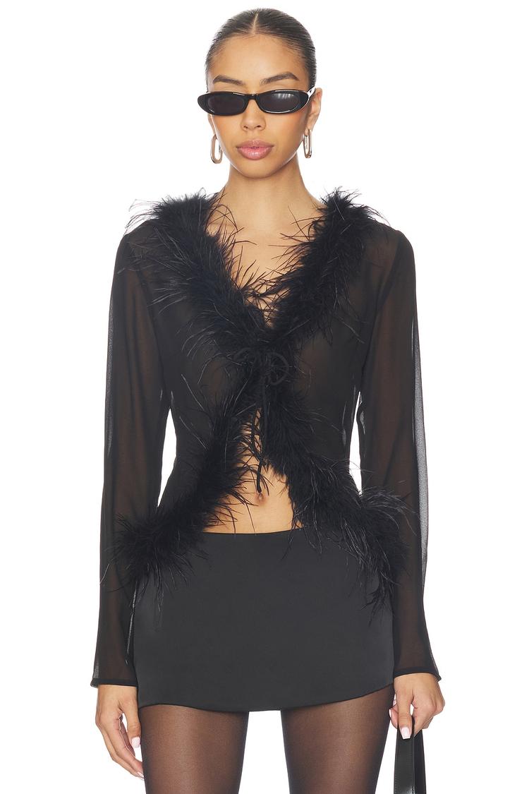 Delicate chiffon fabric and a slim fit define this matte black Wrap top, enhanced with striking matte black ostrich feathers along the collar, front, and hem for a bold, sexy edge. Featuring a deep V-neck and long regular sleeves, the Justine Top offers a sheer panel look that adds allure without sacrificing elegance. The front tie-up closure allows for an adjustable fit, making it a perfect choice for night outs, cocktail parties, or intimate date nights. This modern chic design blends sophistication with playful details for an unforgettable style statement.