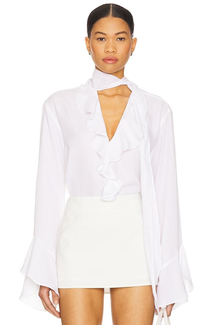 Soft, midweight chiffon creates an elegant silhouette in this relaxed fit blouson top. Featuring a distinctive tie neck and cascading ruffle details along the front and flounce sleeves, this hip-length top embodies classic sophistication. Its long sleeves and covered back add refined coverage, making it a versatile choice for casual days, workwear, or business casual events. The pristine white hue enhances its chic appeal, while the airy fabric ensures comfort across spring and autumn seasons. Perfect for brunch dates or night outs, this top elevates your wardrobe with timeless charm.