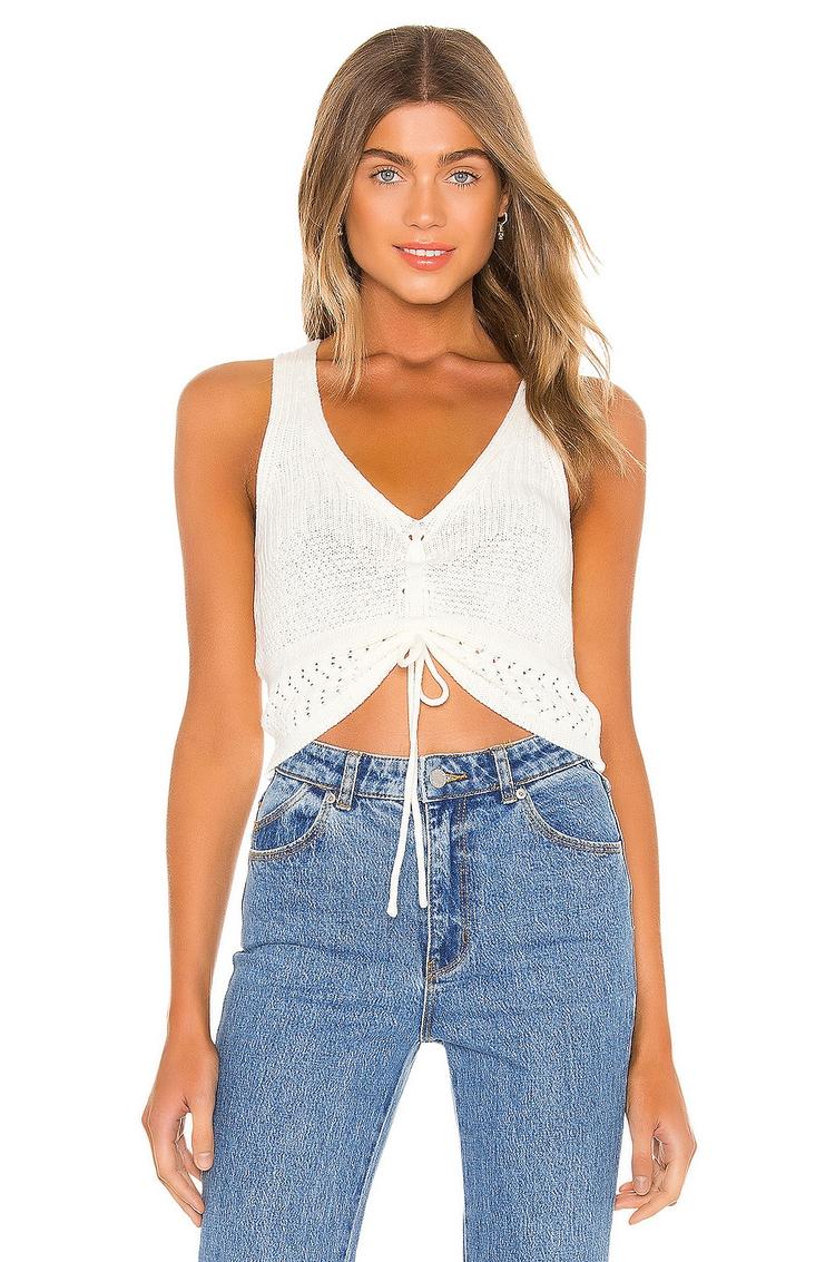 Soft knit fabric and an adjustable ruched front detail bring texture and shape to this cropped tank top. Featuring a slim fit, sleeveless wide straps, and a flattering V-neckline, this white knit top is perfect for spring and summer days. Its versatile style suits casual outings, brunch dates, and night events, offering both comfort and chic appeal. The covered back and pullover closure ensure easy wear, making it a trendy staple for everyday wear.