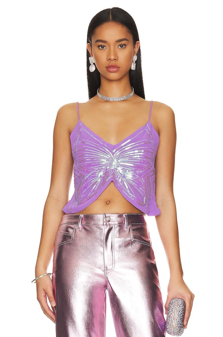 Shimmering purple sequins adorn this cropped camisole, crafted from lightweight polyester for a sleek slim fit. The V-neckline and delicate spaghetti straps enhance its sexy appeal, while the back tie-up closure adds a playful touch. Perfect for warm weather, this trendy top elevates your look for night outs, parties, or girls' nights. Pair it with metallic pants or skirts for a standout cocktail-ready ensemble that combines shimmer and style effortlessly.