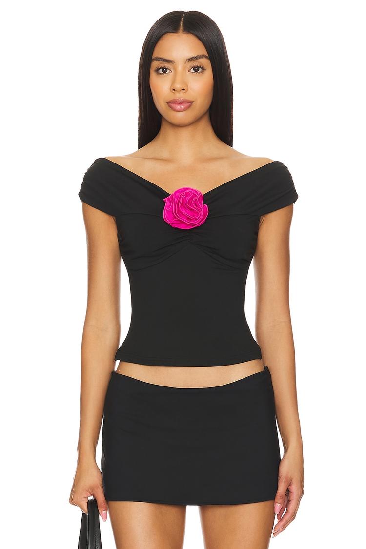 A sleek black cropped top crafted from stretch polyester and elastane jersey knit features a fitted silhouette that hugs the body. Its off-shoulder neckline with cap sleeves creates a chic and sexy look, accentuated by a standout bright pink florette bow detail at the front. This pullover style top is perfect for spring and summer days, ideal for casual outings, brunch dates, or night out events, offering a modern and stylish flair.