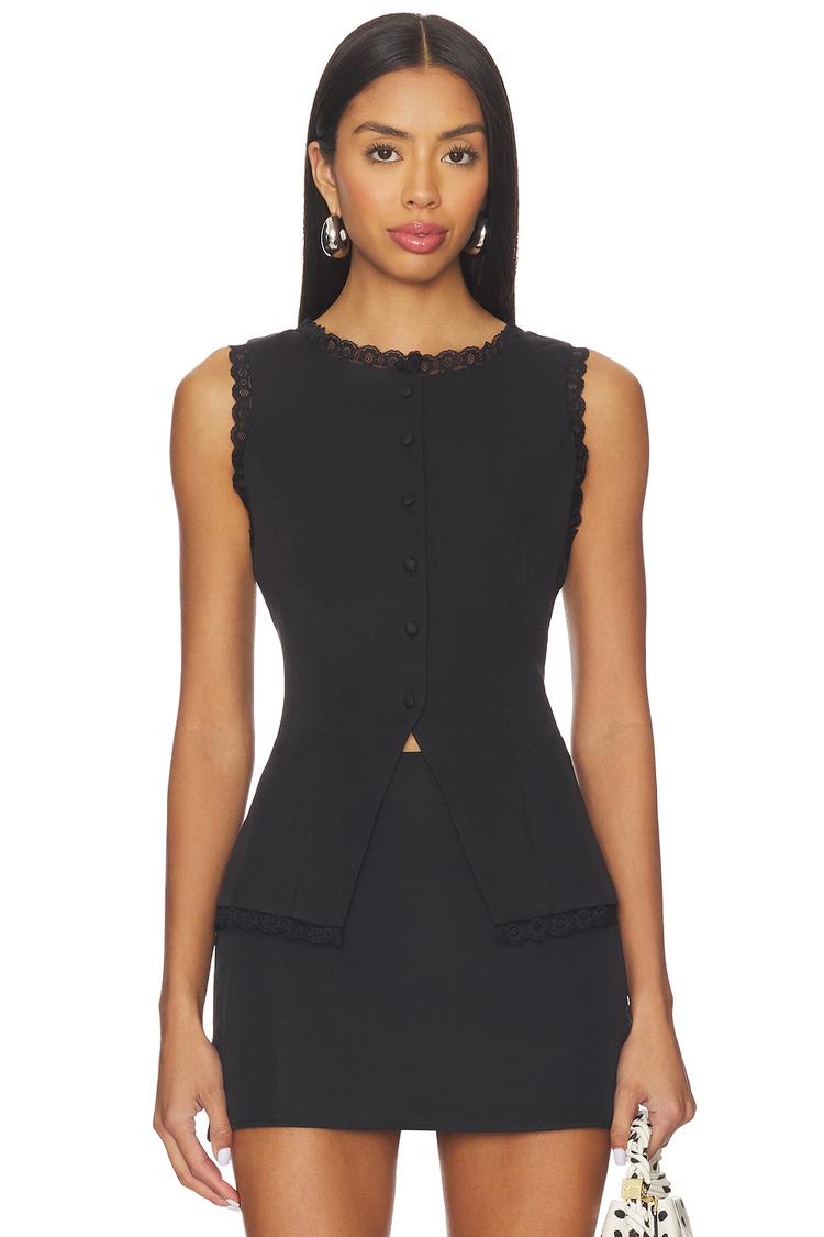 Sleek and sophisticated, this fitted matte black shell top features delicate lace trim along the round neckline, sleeveless armholes, and front button closure for a refined finish. Crafted from polyester with elastane for a comfortable stretch, the hip-length silhouette flatters the figure with a classic, chic appeal. Ideal for casual days, workwear, or business casual settings, it transitions effortlessly to brunch or date night with its timeless design and elegant detailing.