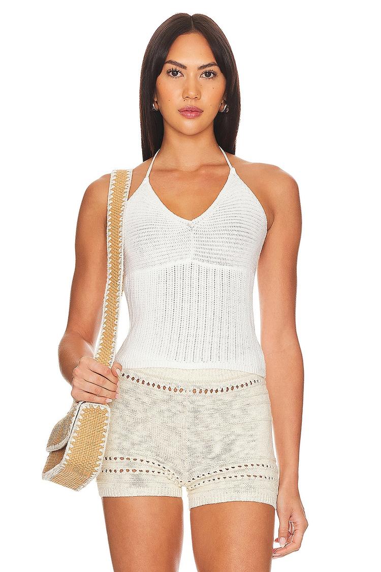 Soft crochet knit fabric and a halter neck tie closure define this fitted camisole top in crisp white. The strapless sleeve styling and waist length hem create a flattering silhouette ideal for warm spring and summer days. Featuring all-over crochet design details, this versatile top pairs effortlessly with casual shorts or skirts for brunch, vacation, or relaxed weekend outings. The breathable blend of viscose, polyamide, and polyester adds comfort and subtle texture to your casual chic wardrobe.