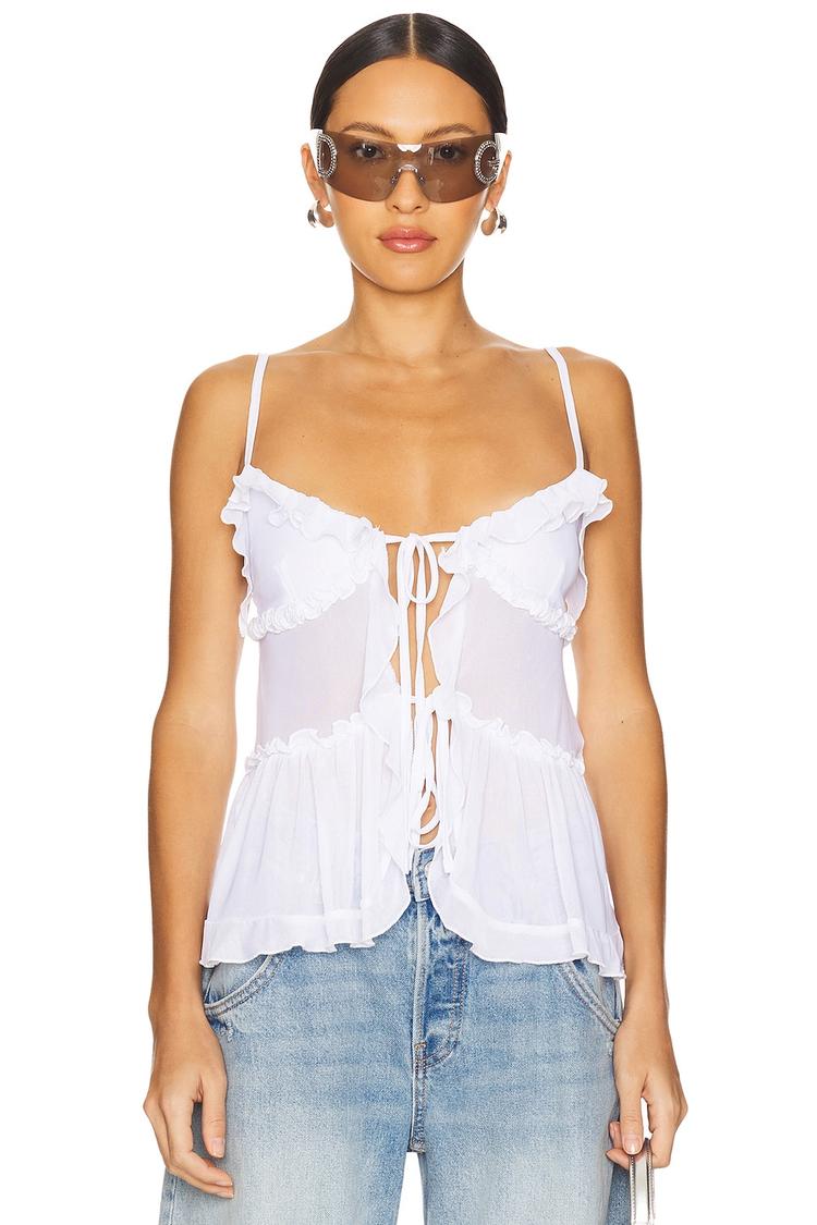 Lightweight mesh and delicate ruffles define this white camisole top with a straight neckline and slender spaghetti straps. The front tie-up closures add a charming detail to the regular fit silhouette, falling gracefully to hip length. Its sheer fabric and airy design make it ideal for spring and summer casual outings, brunches, or date nights. Pair it with jeans or skirts for a breezy, feminine look that combines comfort with a subtle bohemian chic vibe.