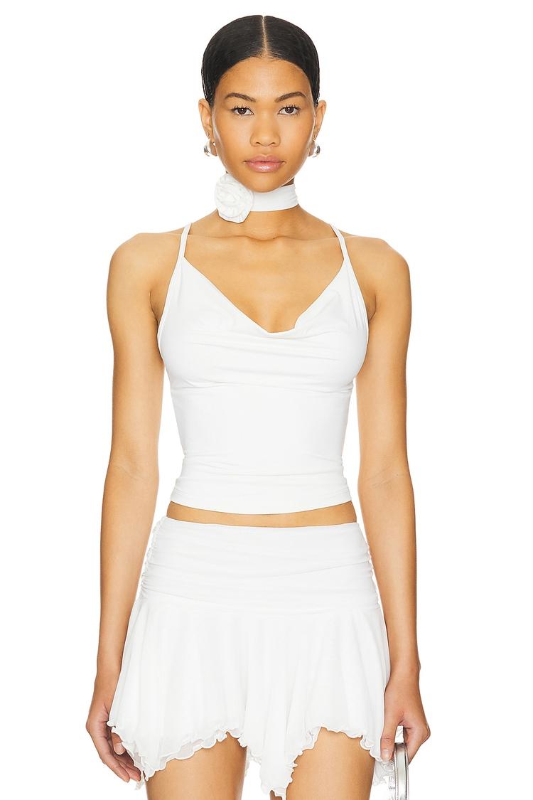 Sleek and fitted, the Tabitha Camisole features a draped cowl neckline and adjustable crisscross back straps that add an alluring touch. Crafted from a slinky nylon-spandex jersey fabric, this cropped top offers a smooth, comfortable fit perfect for warm weather. Its spaghetti straps and sleeveless design make it ideal for spring and summer days. Versatile and stylish, this top suits casual outings, brunch dates, and night outs with ease, combining modern chic style with sexy appeal for a confident look.
