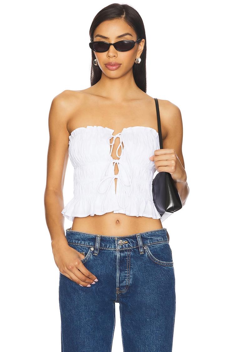 Delicate ruffle details along the hem and front accentuate this cropped, strapless top crafted from midweight poplin fabric blending cotton, nylon, elastane, and polyester. Featuring a slim fit and a straight neckline, it ties at the front for adjustable closure and a flattering silhouette. Perfect for warm spring and summer days, this versatile piece suits casual outings, brunch dates, and vacation adventures with ease and style.