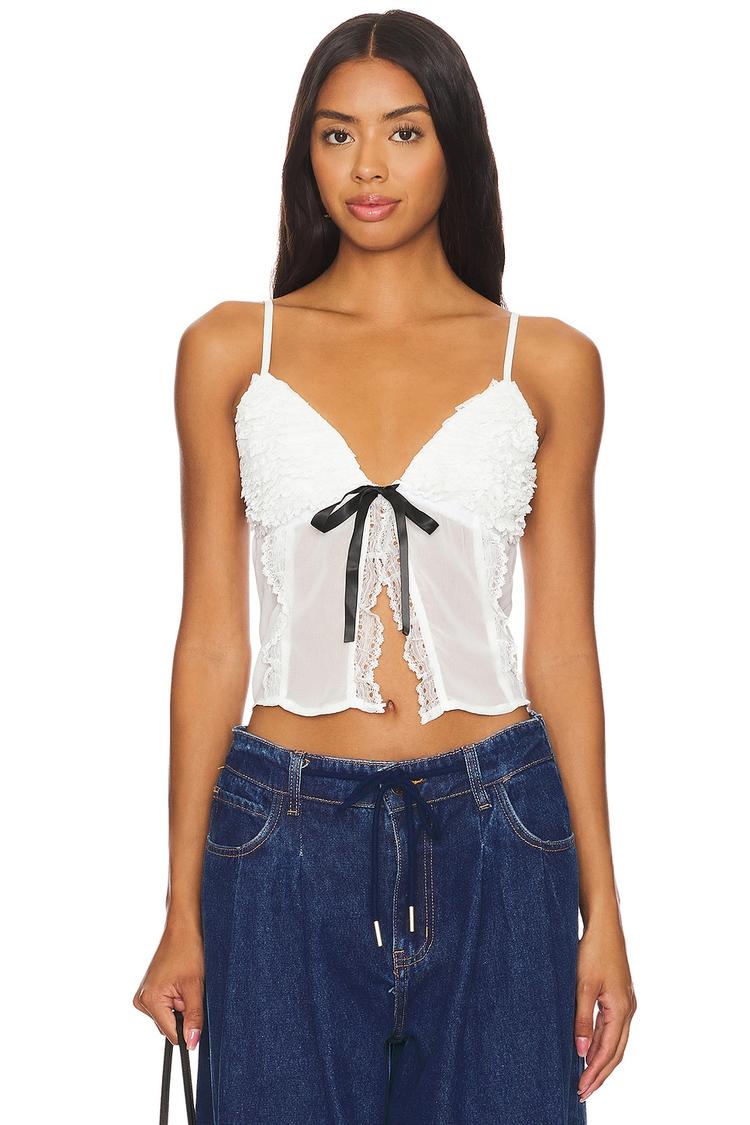 Delicate chiffon fabric combined with lace bust detailing and a flattering V-neckline defines this fitted camisole. Adjustable spaghetti straps and a front satin tie closure add both style and customization to the cropped silhouette. The romantic lace trim and solid white base with a contrasting black bow make it ideal for warm spring and summer days. Effortlessly versatile, this chic top is perfect for casual brunches, date nights, or stylish evening outings where subtle elegance is key.