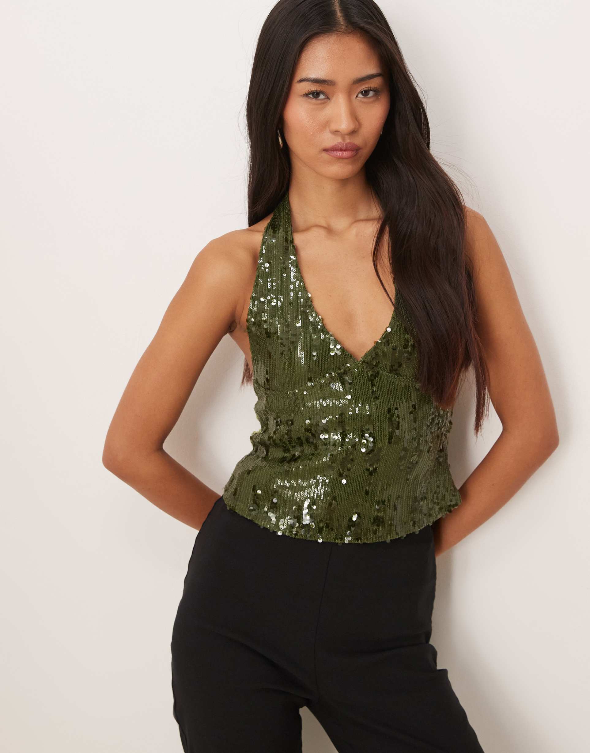 MOTEL COSIO SEQUIN HALTER TOP IN KHAKI