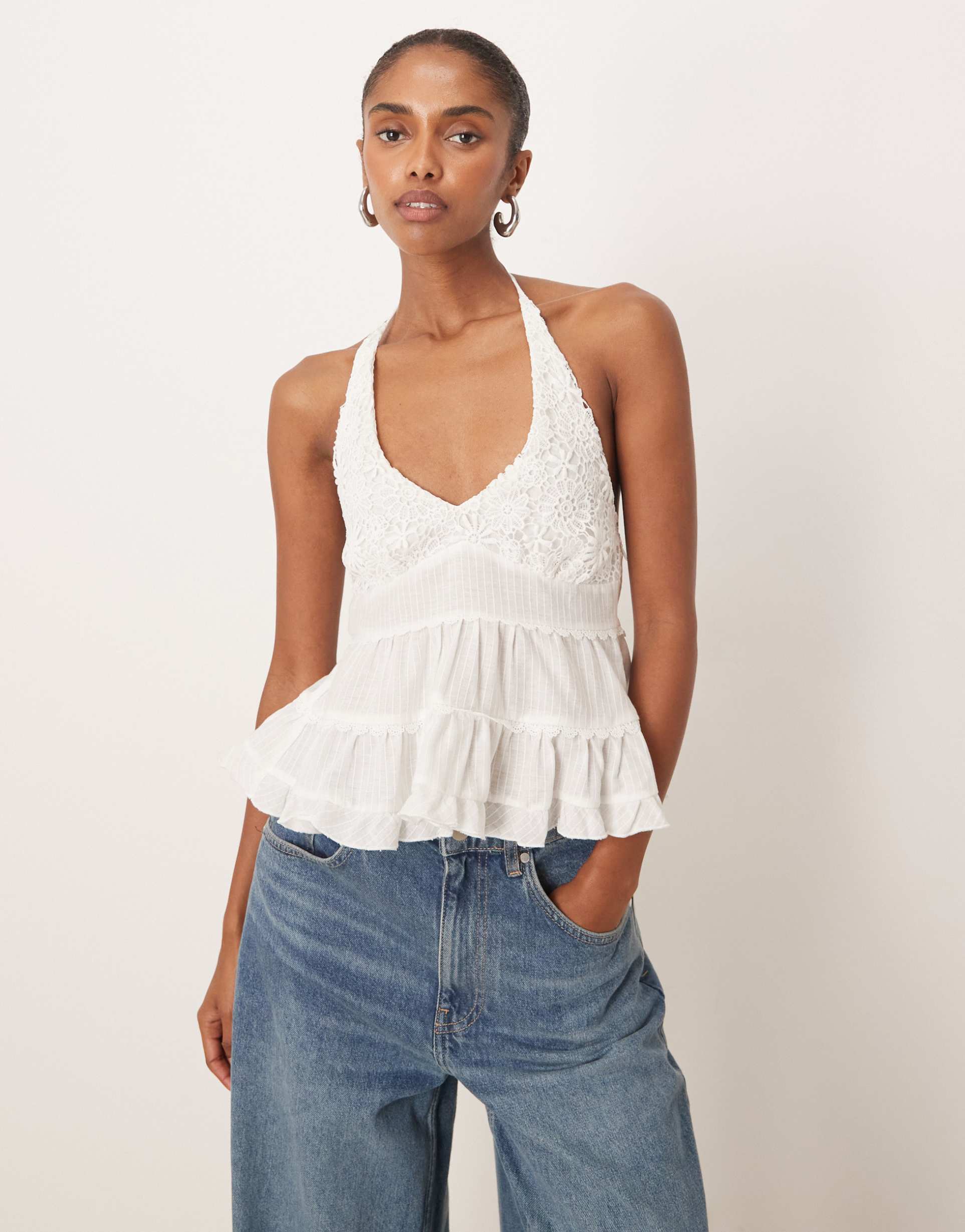 Delicate crochet detailing adorns the bodice and hem of this white halter neck camisole, crafted from lightweight polyester for breathable comfort. Its regular fit and sleeveless silhouette with an open back make it an ideal choice for sunny spring and summer days. The hip-length hem offers a flattering shape that pairs effortlessly with jeans or skirts. Perfect for casual outings, brunch dates, or vacation wear, this top blends bohemian charm with casual chic style.