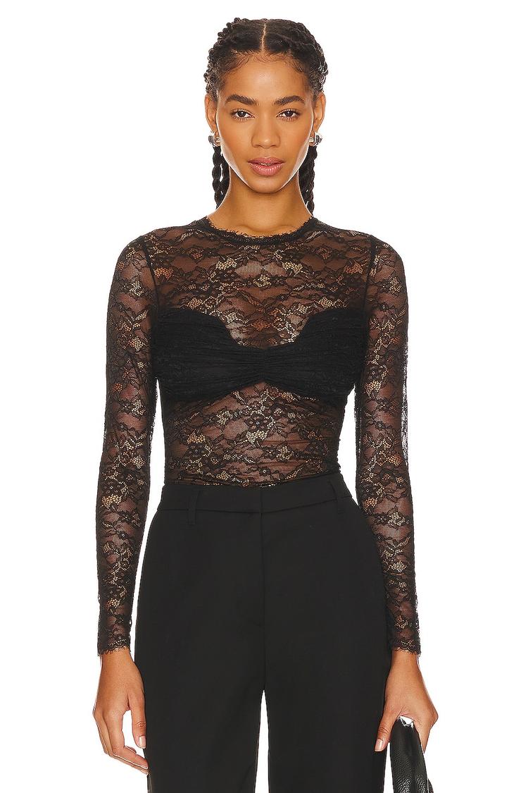 Delicate lace and a fitted silhouette define this waist length shell top, featuring long sleeves and a classic round neckline. The ruched fabric overlay at the bodice adds a sophisticated texture, while the sheer lace fabric creates an alluring, sexy vibe. Crafted from a blend of polyester and nylon, this elegant piece is perfect for cocktail evenings, date nights, or stylish night outs. Its raw-cut hem and semi-sheer design lend a modern edge, making it a chic addition to any wardrobe for multiple occasions.