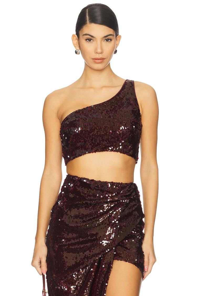 Shimmering dark burgundy sequins envelop this fitted cropped top, creating a chic and sexy silhouette perfect for evening occasions. Featuring an asymmetric neckline and sleeveless design with a single strap, it offers a modern twist on party wear. Fully lined with a side zipper closure for ease, the nylon and elastane blend ensures both comfort and stretch. Ideal for night outs, cocktail events, and festive parties, this eye-catching piece pairs effortlessly with skirts or tailored pants to elevate your look.