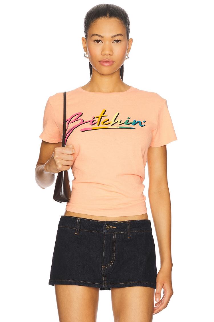 Soft peach cotton jersey with a fitted silhouette defines this cropped top, featuring a classic crew neck and regular half sleeves for everyday ease. The ribbed collar adds subtle texture, while the front graphic detail introduces a splash of casual chic. Ideal for spring through autumn wear, its petite size and midweight fabric make it perfect for brunch, casual outings, or relaxed everyday style.